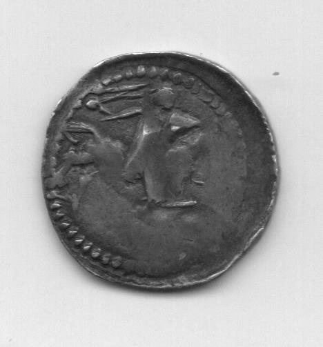A/ à l'intérieur d'un grènetis, cavalier levant son épée et galopant vers la droite.