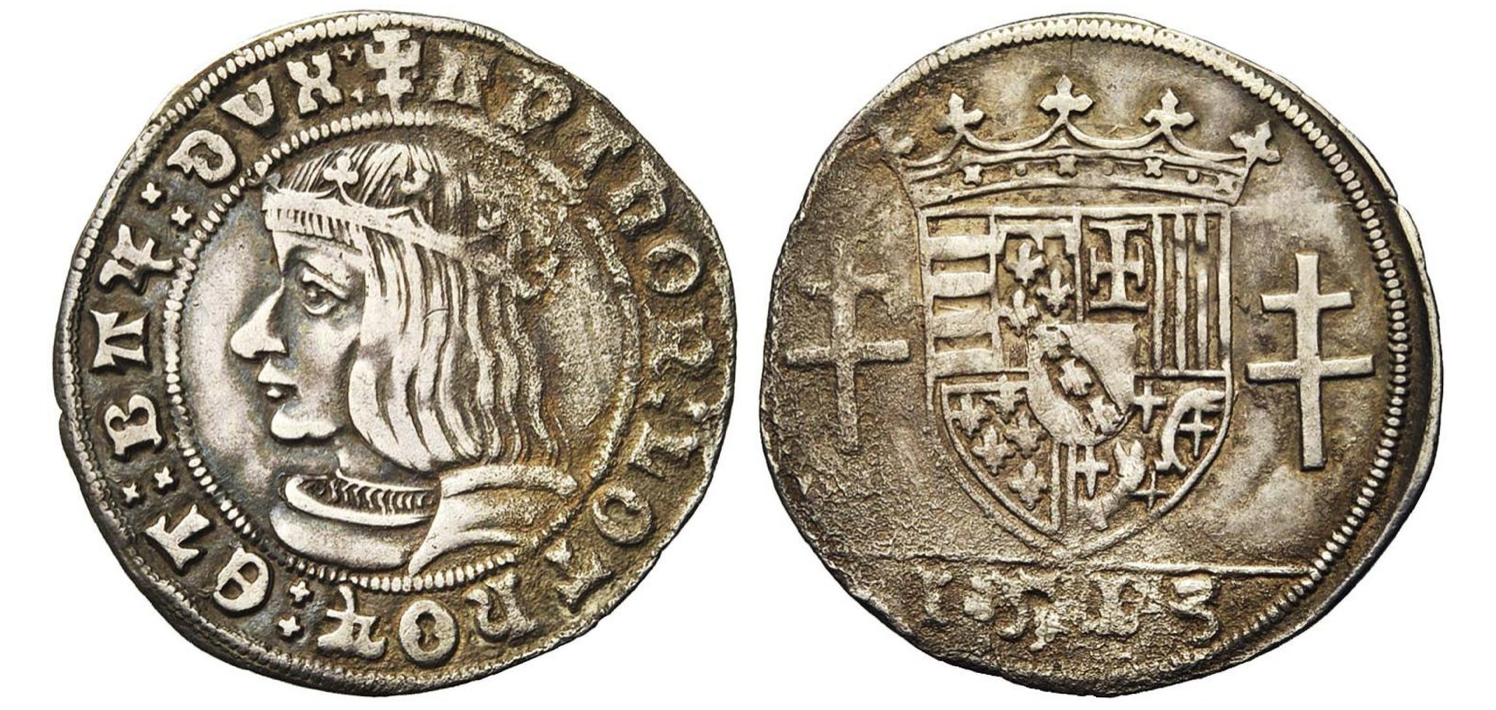 Entre deux grénetis; portrait du duc à gauche.